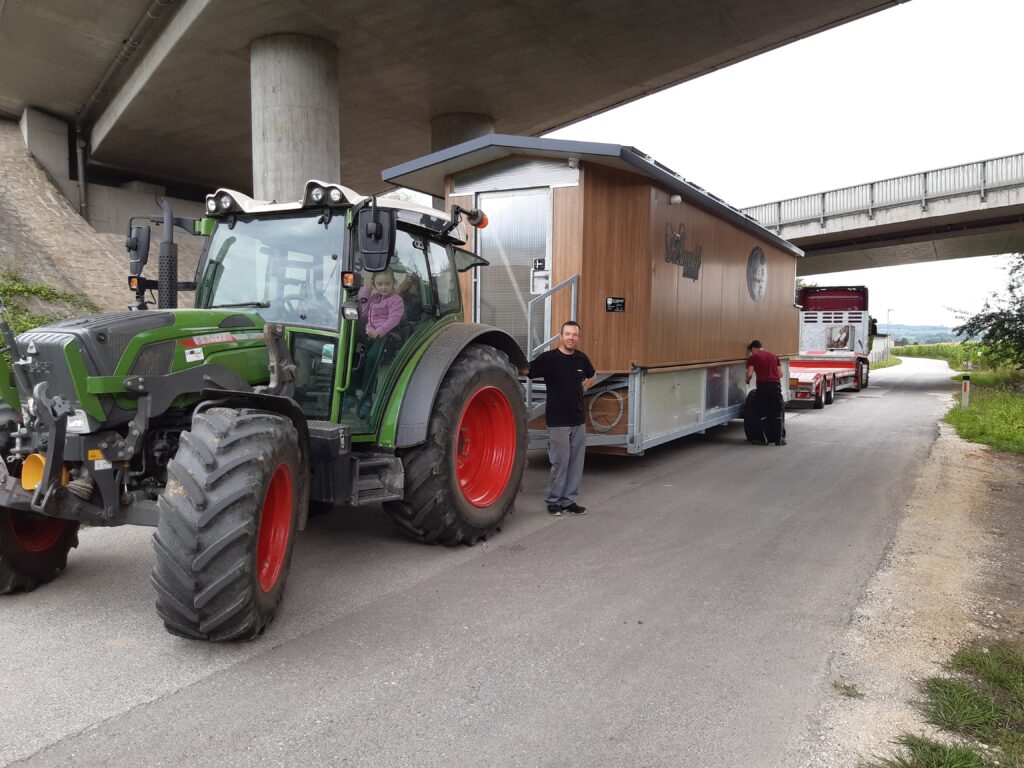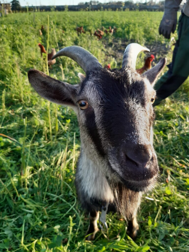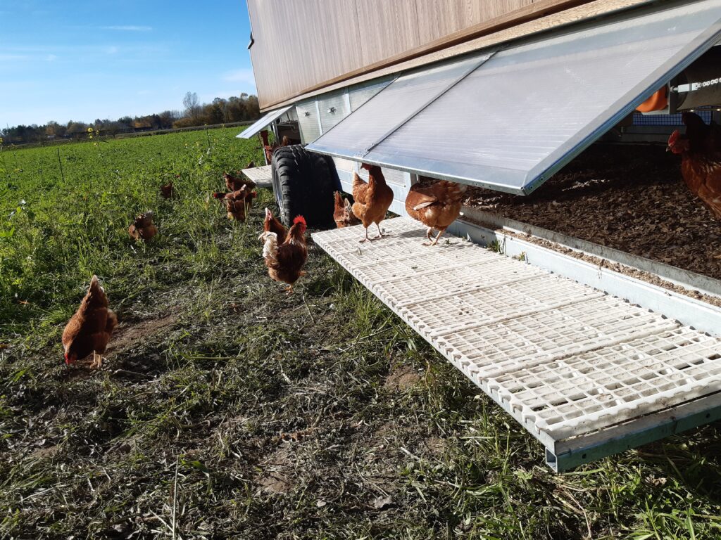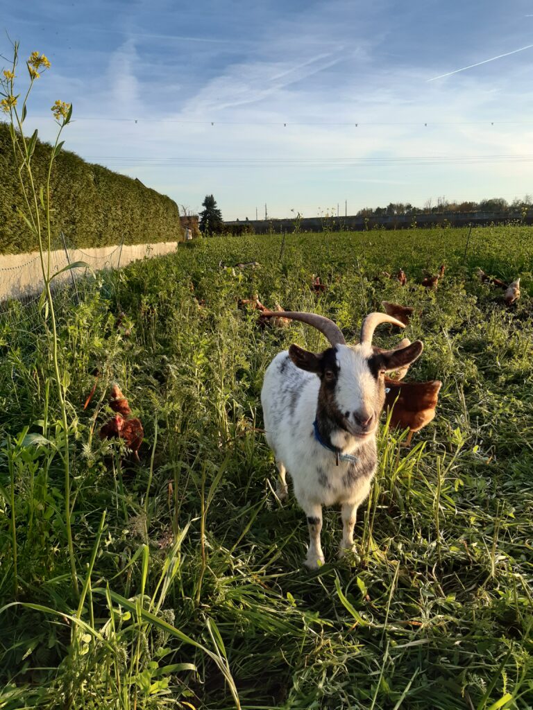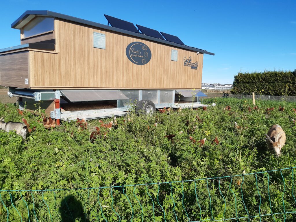 Unser neuer mobiler Hühnerstall gefällt den Hendln hervorragend! Die Ziegen „Elsa“ und „Blume“ begleiten den fahrbaren, energieautarken Stall!